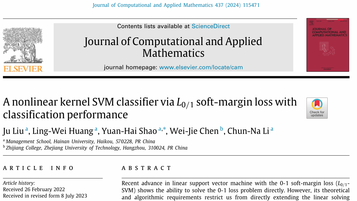近日,邵元海教授团队在中国科学院二区TOP期刊(JCR一区)《Journal of Computational and Applied Mathematics》发表了题为“A nonlinear kernel SVM classifier via L_{0/1} soft-margin loss with classification performance”的文章。该文章的主题是研究分类的0-1损失支持向量机(SVM)智能算法。