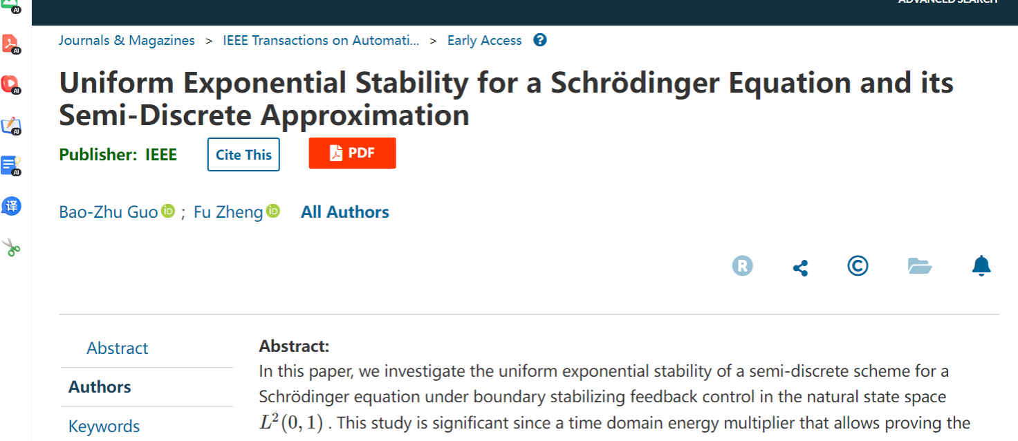 近日,beat365手机版官方网站郑福教授以唯一通讯作者署名的文章“Uniform Exponential Stability for a Schrödinger Equation and its Semi-Discrete Approximation”在控制论领域权威期刊《IEEE Transactions on Automatic Control》在线发表,论文合作者是中国科学院数学与系统科学研究院系统控制重点实验室郭宝珠研究员。