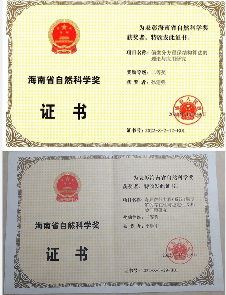 12月5日,海南省科学技术奖励大会在海口召开,省委书记、省人大常委会主任冯飞出席会议并讲话,省委副书记、省长刘小明主持,省委副书记沈丹阳等省领导出席会议。beat365手机版官方网站有20项科研成果获得了2022年度海南省科学技术奖。beat3652项科研成果获得了2022年度海南省自然科学奖,取得了优异的成绩。beat365孙建强教授主持申报的“偏微分方程保结构算法的理论与应用研究”获得了海南省自然科学奖二等奖,李胜军教授主持申报的“奇异微分方程(系统)周期解的存在性与稳定性及相关问题研究”获得了海南省自然科学奖三等奖。表明beat365数学学科微分方程理论与数值方法的研究取得了重大进展。
