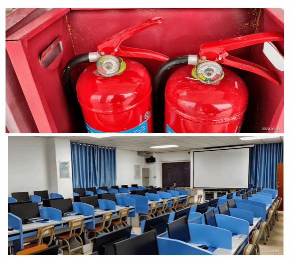 实验室外统一配备了灭火器,灭火器性能正常。另外9教203实验室所在9教有多个学院的实验室,9教使用主体是计算机学院、所以消防通道和其他消防设施一般是计算机学院在进行维护和管理,目前情况正常。