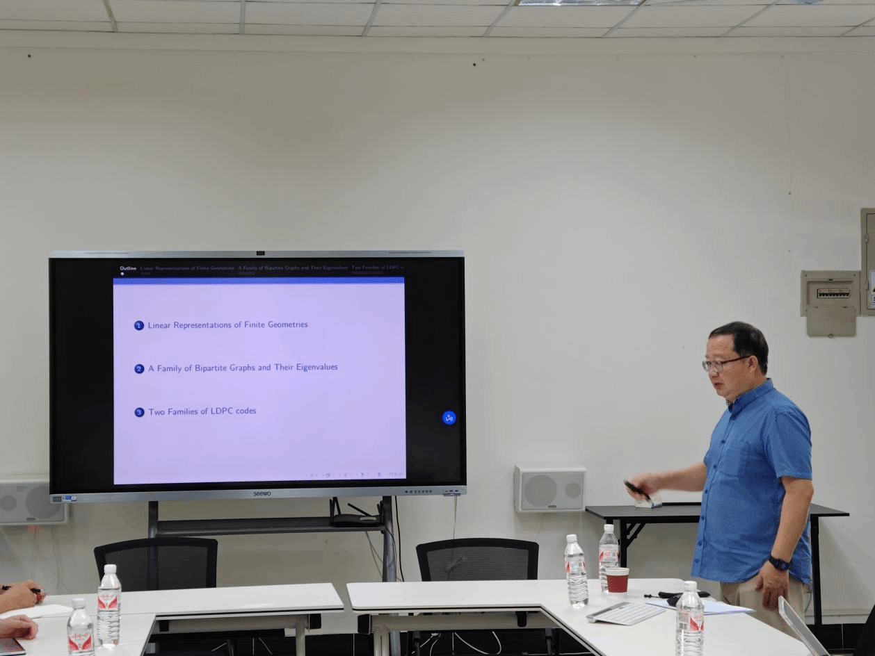 5月3日下午,南方科技大学数学系讲席教授、数学系系主任向青教授应邀在beat365手机版官方网站做了题为“Linear Representations of Finite Geometries and Associated LDPC Codes”的学术报告,报告内容主要来自报告人自己的研究成果,学院和琼台师范学院数学系的部分师生聆听了报告。