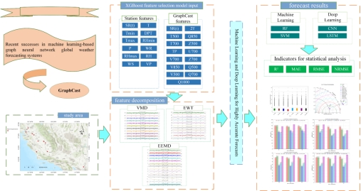 首创“变分模态分解(VMD)+全球预报系统图神经网络(GraphCast)”的混合预测框架,有效突破单一模型的技术局限。开发基于XGBoost特征选择的多维度气象变量组合方案,建立C1-C3三级输入组合系统,显著提升模型泛化能力。构建VMD-GC-RF优化模型,相较传统站点气象数据模型,预测误差降低58.73%,实现了较高的太阳辐射预测精度。此外,与 Google DeepMind 推出的 GraphCast 系统相比,本模型在太阳辐射预报领域展现出更强的专业适应性,填补了其在该细分领域的技术空白,为光伏发电与农业气象服务等应用场景提供了可靠支撑。