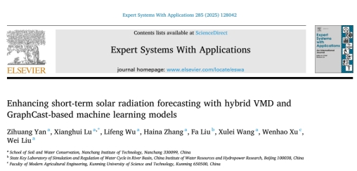 近日,贝博官网水土保持与农林水文科技创新与导师团队2022级硕士研究生闫子黄在国际Top期刊《Expert Systems with Applications》(最新影响因子7.5,中科院一区Top期刊)发表题为“Enhancing short-term solar radiation forecasting with hybrid VMD and GraphCast-based machine learning models”的创新研究成果,南昌工程学院为第一署名单位,通讯作者为该团队负责人鲁向晖教授。